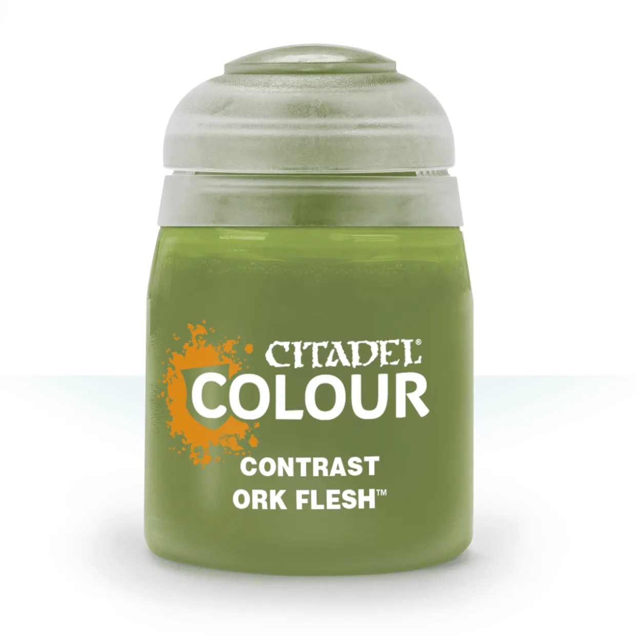The Citadel Colour 18ml Contrast Ork Flesh Acrylic Paint from the acrylic paints range provides a superb quality paint for Warhammer 40K and Games Workshop model making.