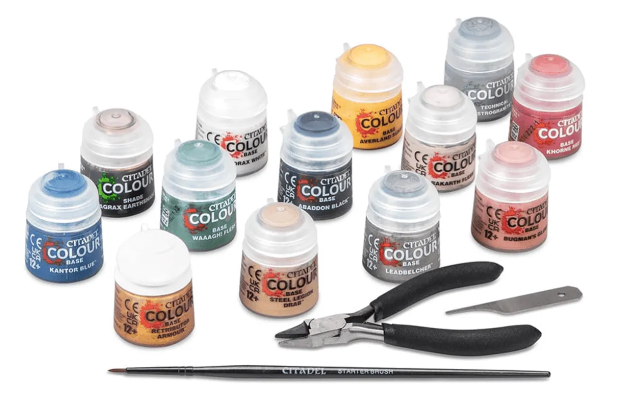 If you have your eye on the Starter Set or Ultimate Starter Set and also want the paints and tools you need to get hobbying right away, then this Paint and Tools Set has the goods. It contains a pair of Citadel Starter Set clippers, a starter brush, and a mouldline scraper, plus 13 12ml paint pots: Corax White, Abaddon Black, Averland Sunset, Leadbelcher, Kantor Blue, Khorne Red, Rakarth Flesh, Retributor Armour, Waaagh! Flesh, Bugman’s Glow, Steel Legion Drab, Agrax Earthshade, and Astrogranite.