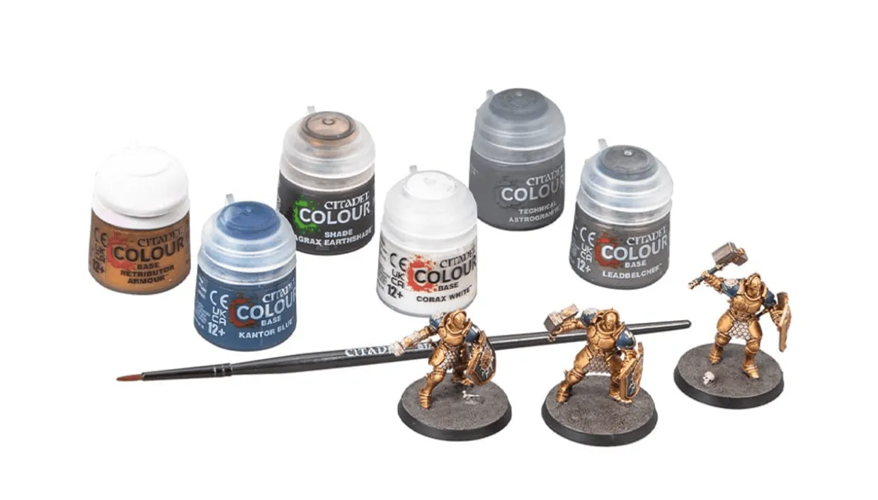 The Stormcast Eternals Paint Set contains three push-fit Liberators, a Citadel starter brush, and six 12ml pots of paint: Retributor Armour, Kantor Blue, Corax White, Leadbelcher, Agrax Earthshade, and Astrogranite.