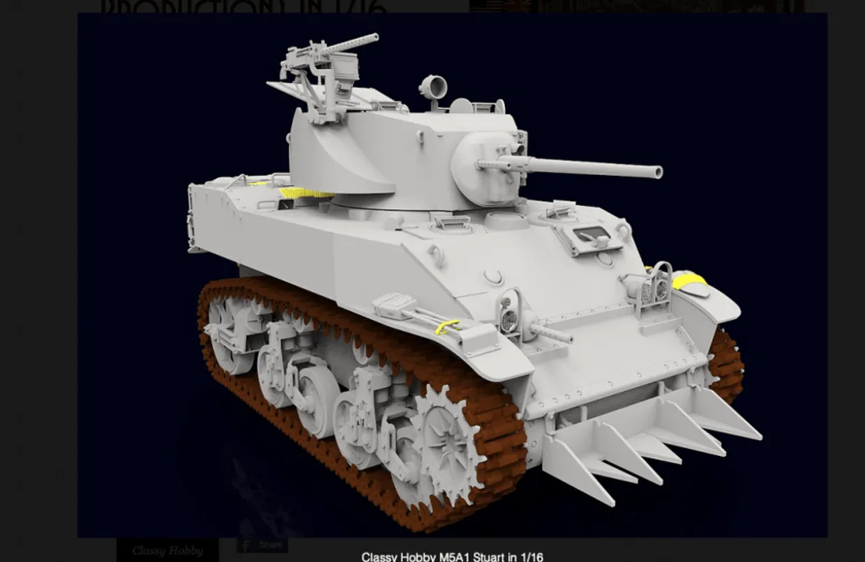 The Classy Hobby 1/16 M5A1 Stuart Light Tank Late Production from our 1/16 scale military vehicle model kits range range accurately recreates the real-life American light tank from World War II. This plastic model kit requires paint and glue to complete.