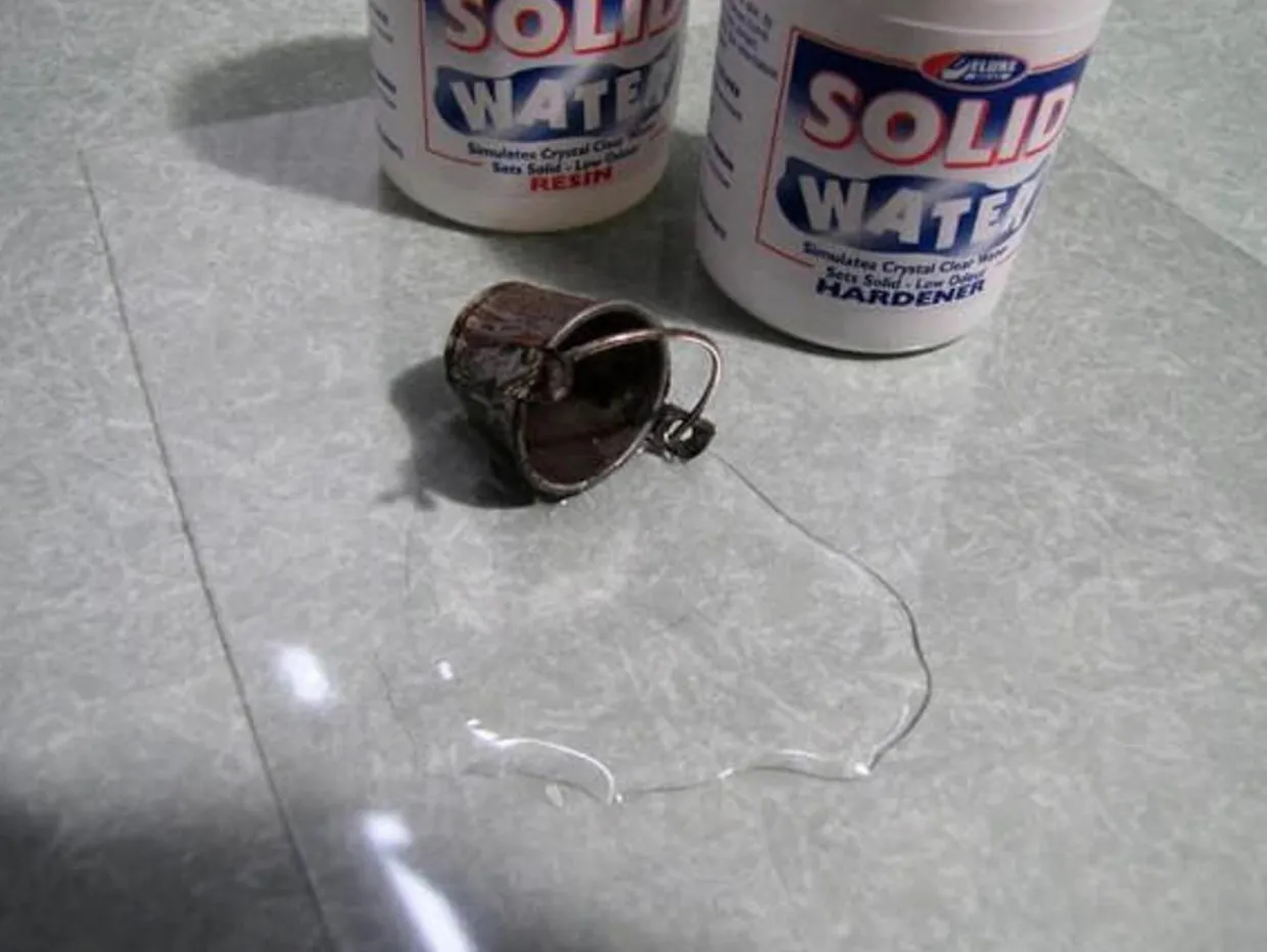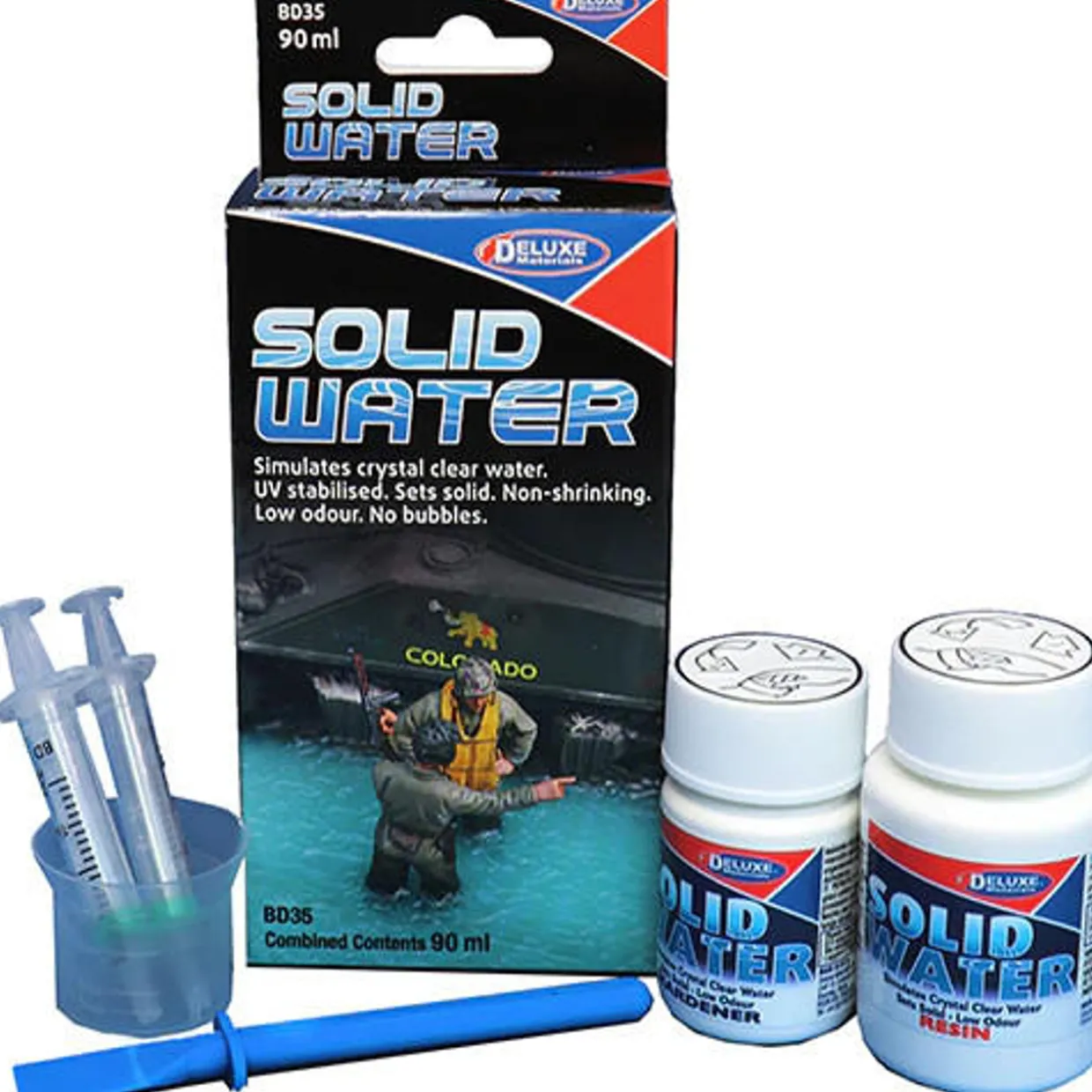 Solid Water is a low odour, 2 part resin for simulating crystal clear water for miniature bowls, garden ponds and puddles. Creates the illusion of deep water with minimal thickness. Use it for still water (canals or lakes) in railway layouts or dioramas. Can be textured to create moving water effects.