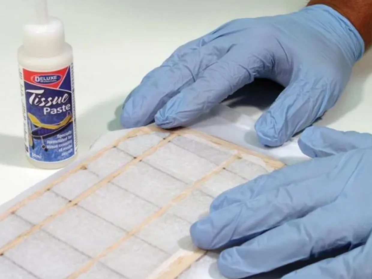 Clear drying paste for bonding tissue paper used on traditional model airplanes. The formulation allows delicate tissue paper to be placed onto airframes and smoothed without tearing.