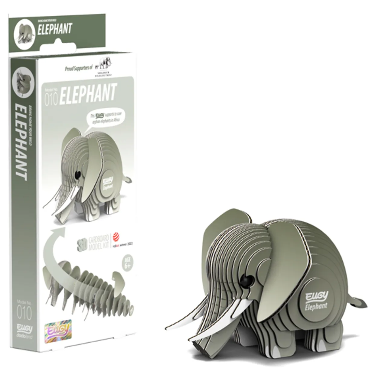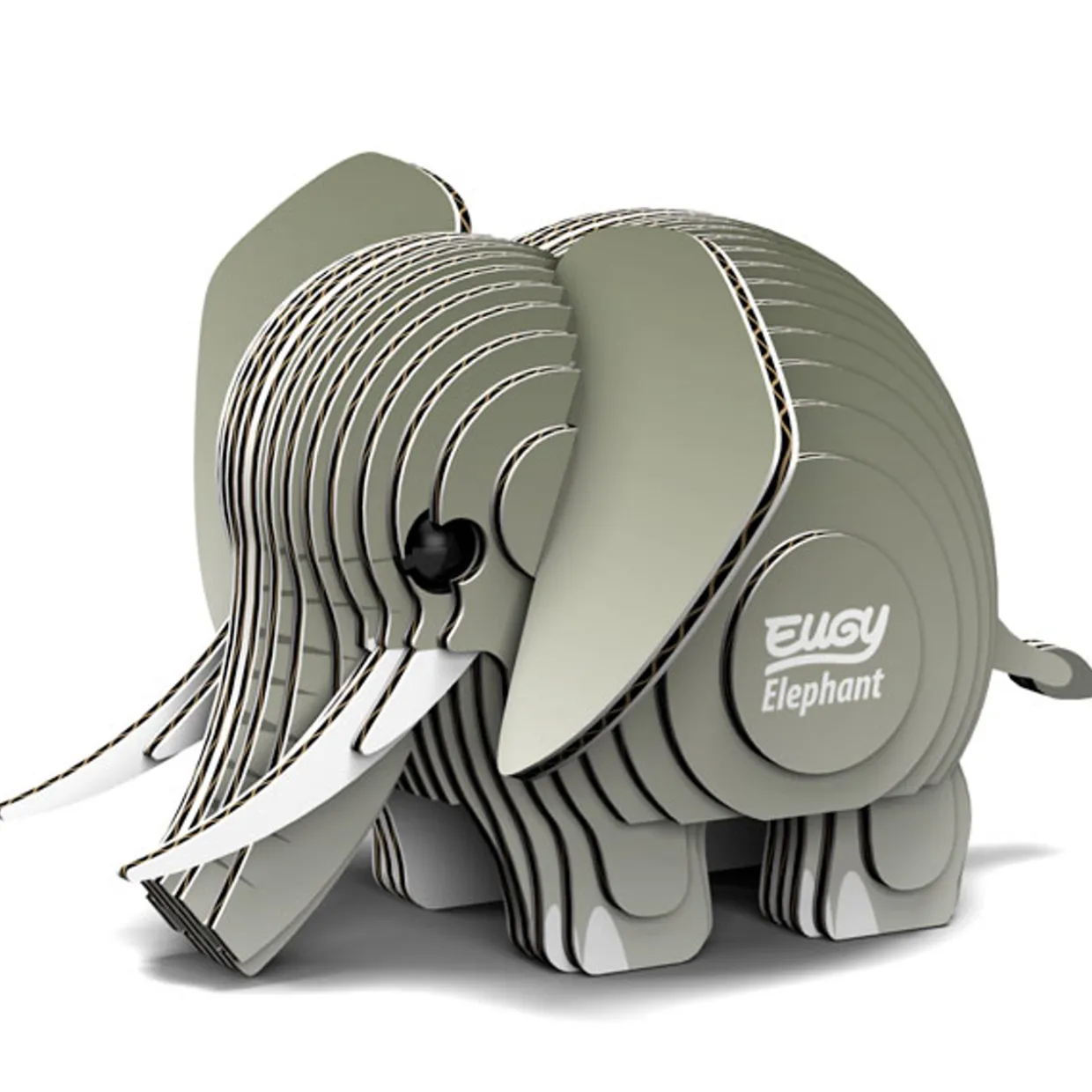 The Eugy Elephant is a 3D puzzle made from cardboard, designed for children ages 4 and up.