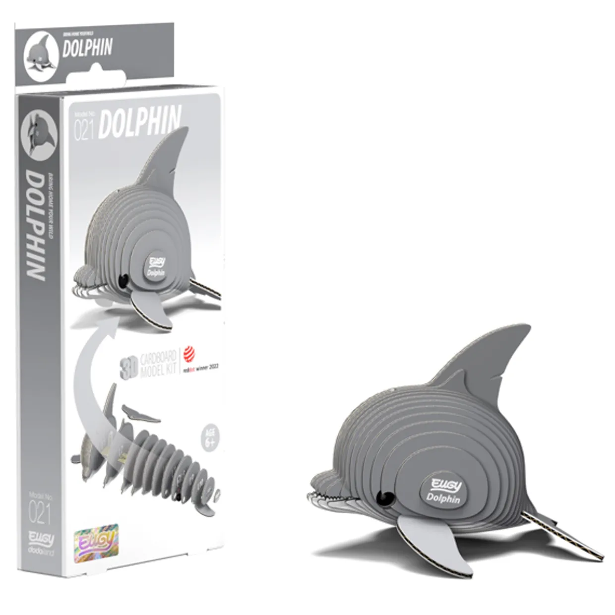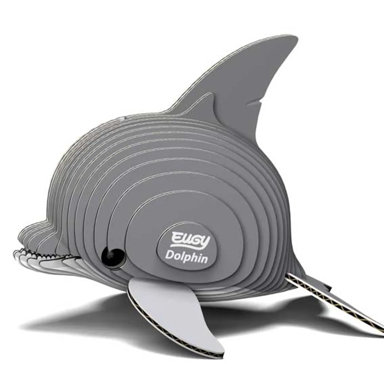 The Eugy Dolphin is a 3D puzzle made from cardboard, designed for children ages 4 and up.
