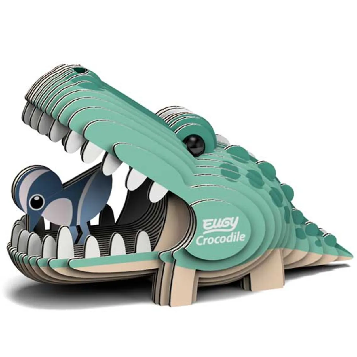 The Eugy Crocodile is a 3D puzzle made from cardboard, designed for children ages 4 and up.