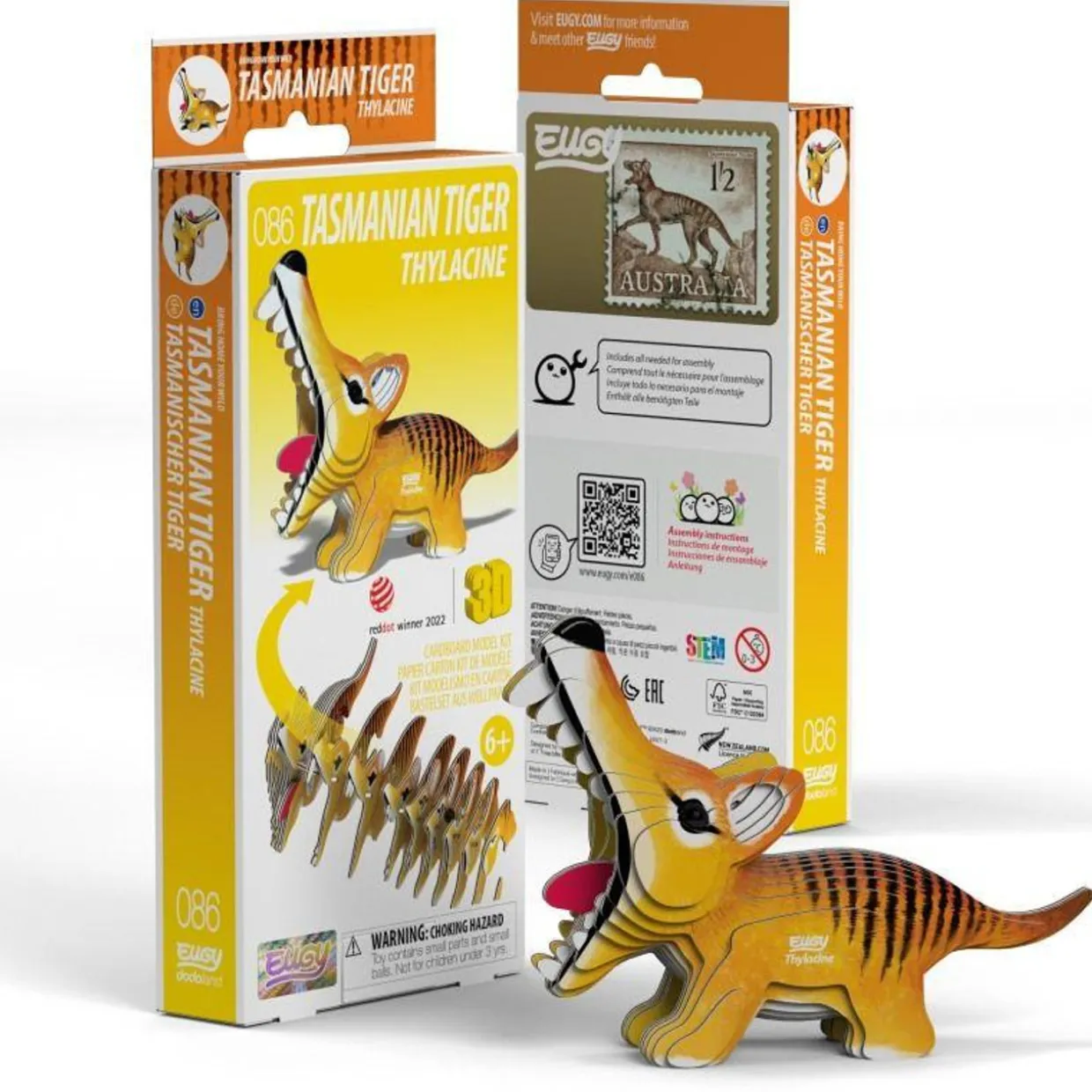 The Eugy 086 Tasmanian Tiger (Thylacine) is a 3D puzzle made from cardboard, designed for children ages 4 and up.