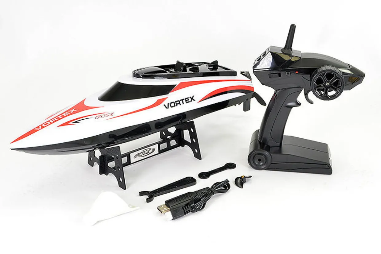This summer get ready to hit the water with the new Vortex fast electric r/c boat from FTX. With a range of up to 100m the Vortex is perfect for pools, ponds and even lakes. Featuring an attractive moulded hull with printed graphics, at 44cm long the Vortex is the ideal size for first time r/c boat enthusiasts.
