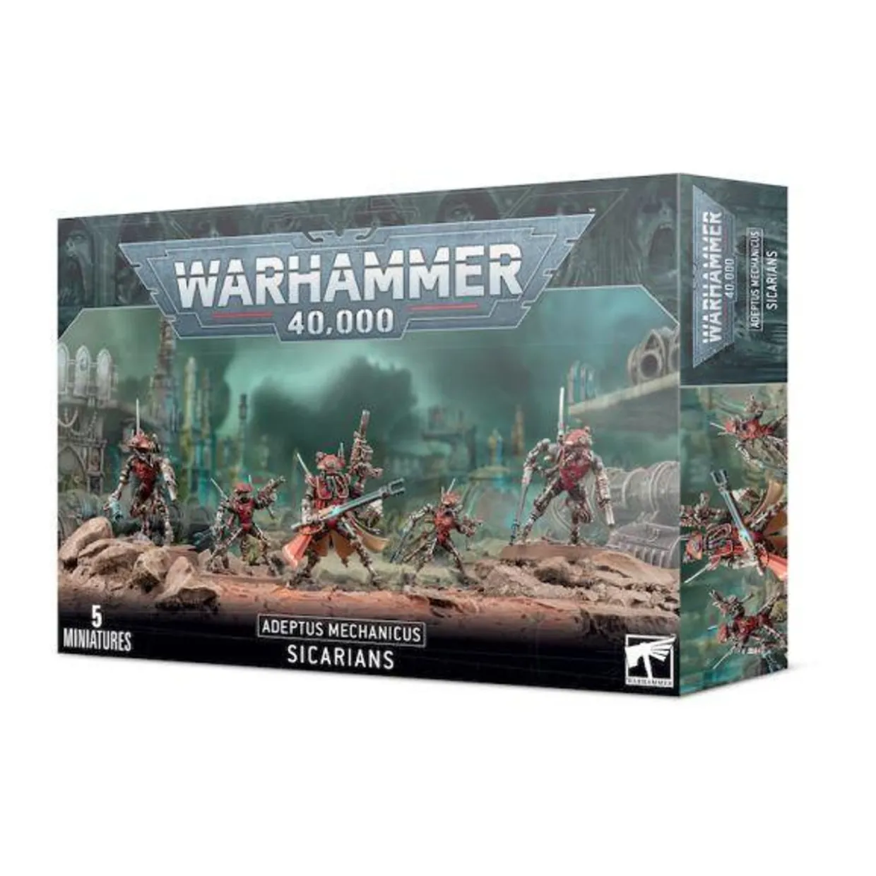 The Adeptus Mechanicus Sicarian Ruststalkers &Infiltrators from the Warhammer 40k range provides a set of highly detailed figures for your Adeptus Mechanicus collection.Initially an elite assassination squad, the Sicarian Ruststalkers proved so effective at the art of killing that they were repurposed as front-line, physics-manipulating commandos. Their transonic weapons hum and resonate with sickening efficiency, passing through the strongest armour as if it simply didnt exist.Now more machine than man, the Sicarian Infiltrators are a hideous, frightening strike force – the height of Adeptus Mechanicus posthuman engineering. Enemies fall, deafened and blinded by the scree of a brutally disruptive audiovisual assault; battles are often decided before even a single kill is confirmed.The Sicarian Infiltrators are the scout class; almost their entire human heads have been replaced with an intricate domed helm allowing a three-hundred and sixty degree view of the battlefield. Two weapon options are available to each model – ten sets of stubcarbine and power sword, or ten sets of taser goad and flechette blaster; a total of twenty weapons in the box. Their princeps carries a stubcarbine and power sword, with an included infoslave skull – every movement recorded and analysed for the optimisation of battle.This multi-part plastic kit contains all the parts necessary to build five Adeptus Mechanicus Sicarians – either Sicarian Ruststalkers or Sicarian Infiltrators, including one princeps. Each model features extensive body modification – flesh has given way to machine, and what little remains is encased in pressurised armour. Sensors, pressure gauges and data arrays cover their surfaces, and an included five sets of legs add a variety of posing options, making your squad truly your own.The box contains 5 different, cybernetically augmented gasmask-clad Sicarian Ruststalker heads, covered in sensors and data-gathering devices to further the quest for knowledge. More machine than man now, their bodies are encased in pressurised armour. An impressive array of armament options include two transonic blades each, or a loadout of chordclaw, transonic razor and grenade pack, making a total of twenty-five included weapon parts. Their princeps includes a prehensile dataspike.This 117-component, multi-part plastic kit contains all the parts necessary to make either five Sicarian Ruststalkers (including one princeps), or five Sicarian Infiltrators, and comes with five 40mm bases.