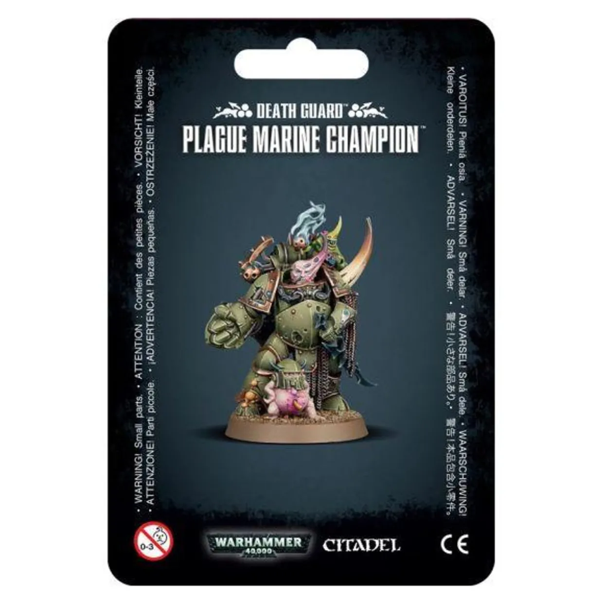 Sworn to Nurgles service, Plague Marines have disgusting, rotted bodies that stink of decay. The putrescent slime that oozes from their sores corrodes armour and boils away skin, yet despite their horrific disfigurements they are fearsome warriors indeed. Their rotting brains are inured to the agony of bodily corruption, making them all but immune to the pain or debilitation caused by battle wounds.This multi-part plastic kit contains the components necessary to assemble a Plague Marine Champion, who can be added to a unit of Plague Marines. Clad in bulging, rusted power armour, he comes with a choice of two variant heads one helmeted, and one bare (with an unsettlingly large horn growing out of his face…). Befitting his Champion status, he is decked out in chainmail, with a cloak prominently featuring the symbol of Nurgle. He is armed with a plaguesword and power fist, and includes a boltgun which hangs from his backpack. 2 Nurglings are included one atop his shoulder, clutching a smoking censer, and one optional Nurgling for his base, comically clad in a Death Guard helmet.This kit comes as 8 components, and is supplied with a Citadel 32mm Round base.