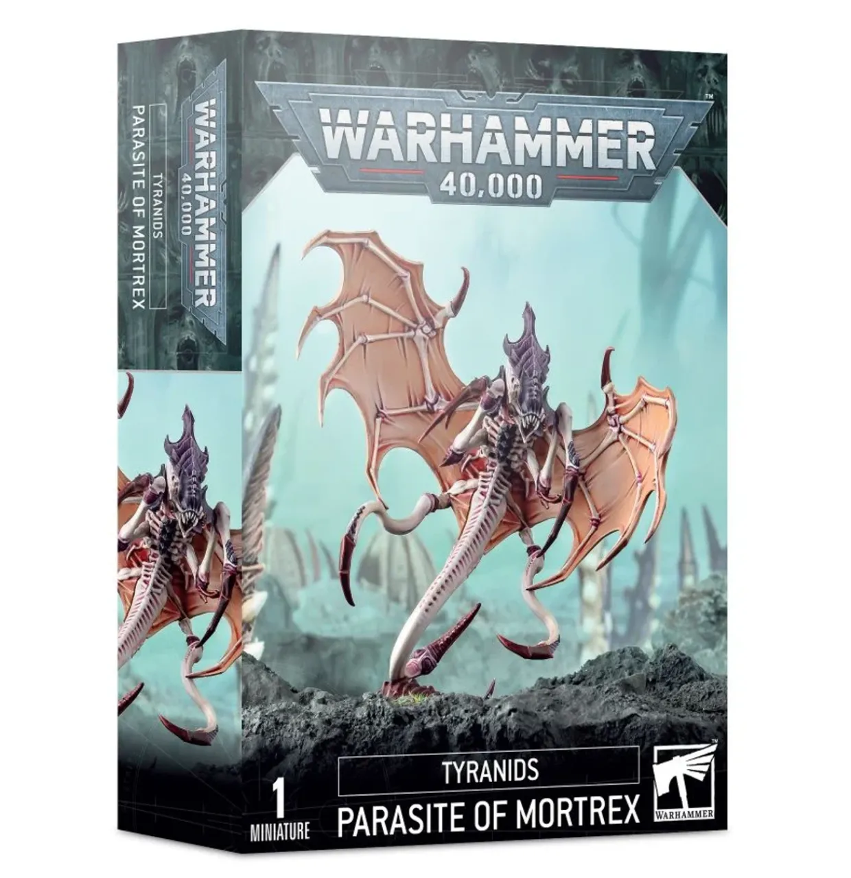 This kit bullds one Parasite of Mortrex. Armed with clawed limbs and a barbed ovipositor, this winged beast is a mobile incubation organism housing hundreds of Ripper pods. With a host of horrifying abilities, this unique biomorph adds disruptive tactical options to the already unpredictable tendrils of the Hive Fleet.