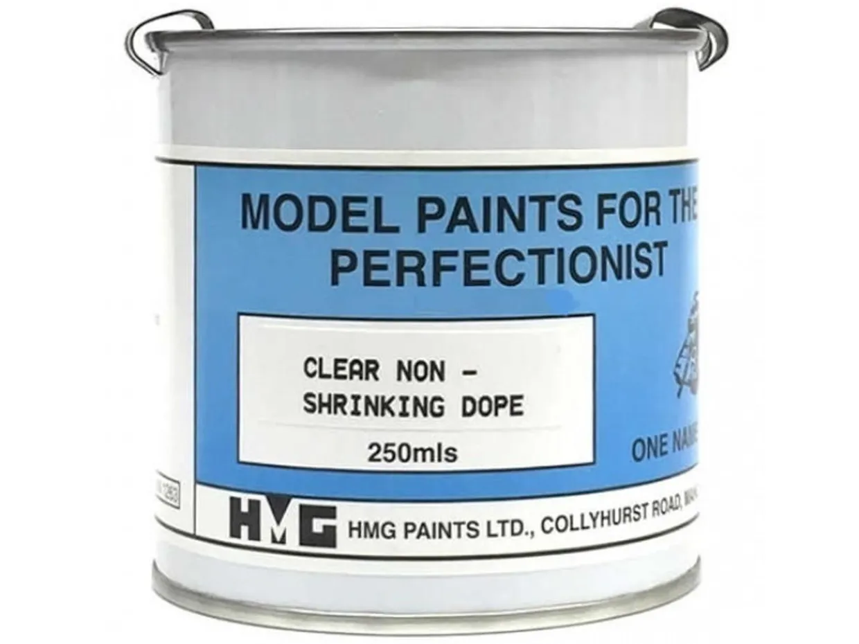 The HMG Non-Shrinking Dope 250ml from the wooden model accessories range provides a clear dope for hardening tissue used for covering wooden aircraft kits.