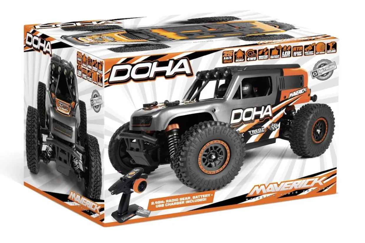 The HPI Maverick RC Maverick Doha 1/20 4WD Electric Truck – Orange, a compact yet powerful off-road vehicle from Maverick RC. This 1/20 scale 4WD truck combines the rugged capabilities of larger RC models with the convenience of a size that fits comfortably in your hand, offering unmatched versatility for off-road exploration.
