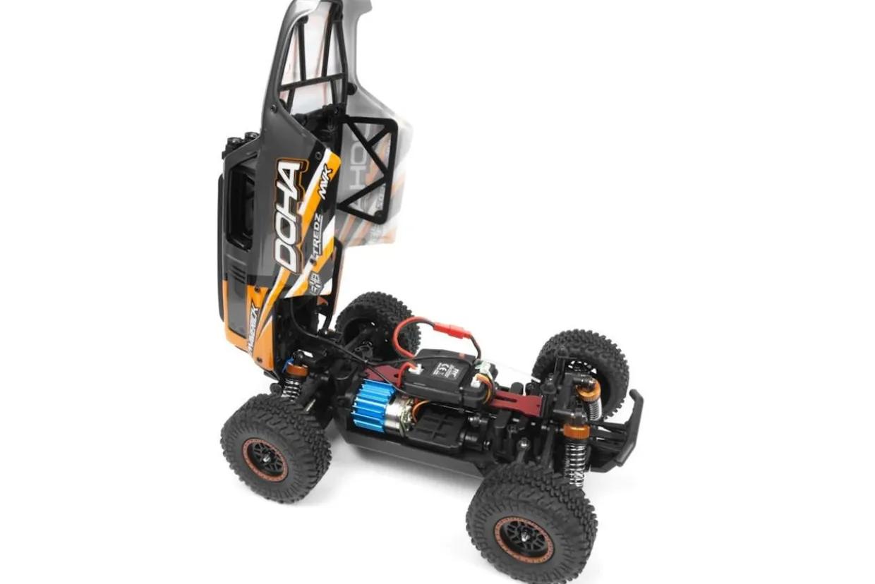 The DOHA features a durable shaft drivetrain and 3-gear differentials, ensuring optimal power distribution for exceptional stability and precision handling across diverse terrains. Its reinforced cage design, coupled with a custom screen-printed, rear-hinged Desert truck body, not only enhances its visual appeal but also provides easy access to the battery tray. Available in four distinctive color options, the DOHA allows for a personalized touch.