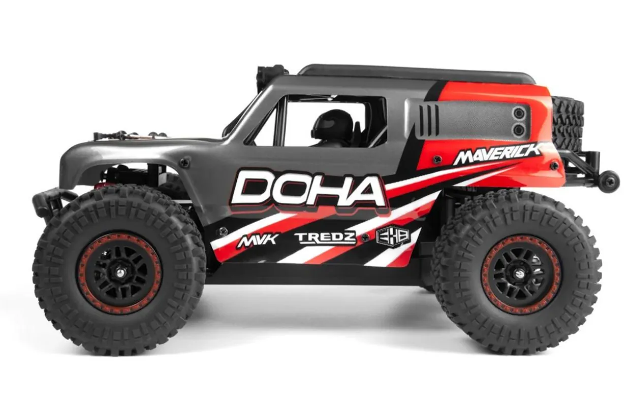 The HPI Maverick RC Maverick Doha 1/20 4WD Electric Truck – Red, a compact yet powerful off-road vehicle from Maverick RC. This 1/20 scale 4WD truck combines the rugged capabilities of larger RC models with the convenience of a size that fits comfortably in your hand, offering unmatched versatility for off-road exploration.