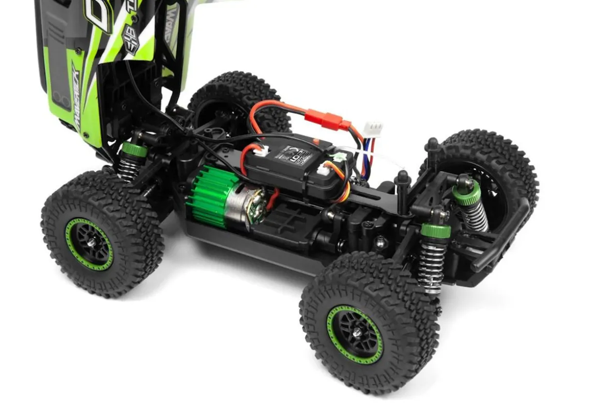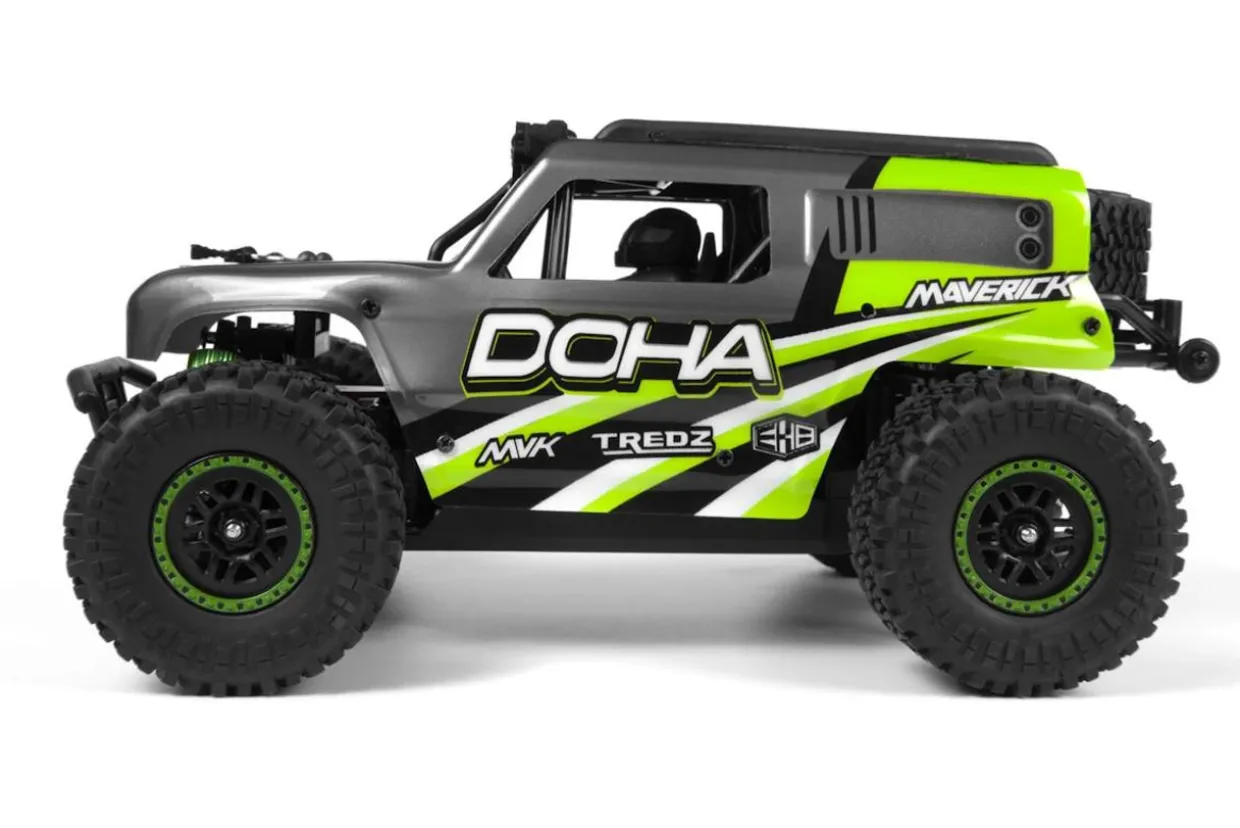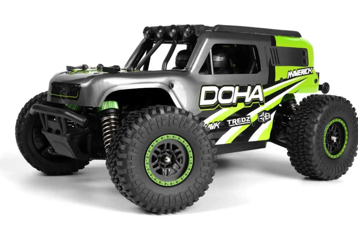 The HPI Maverick RC Maverick Doha 1/20 4WD Electric Truck – Green, a compact yet powerful off-road vehicle from Maverick RC. This 1/20 scale 4WD truck combines the rugged capabilities of larger RC models with the convenience of a size that fits comfortably in your hand, offering unmatched versatility for off-road exploration.