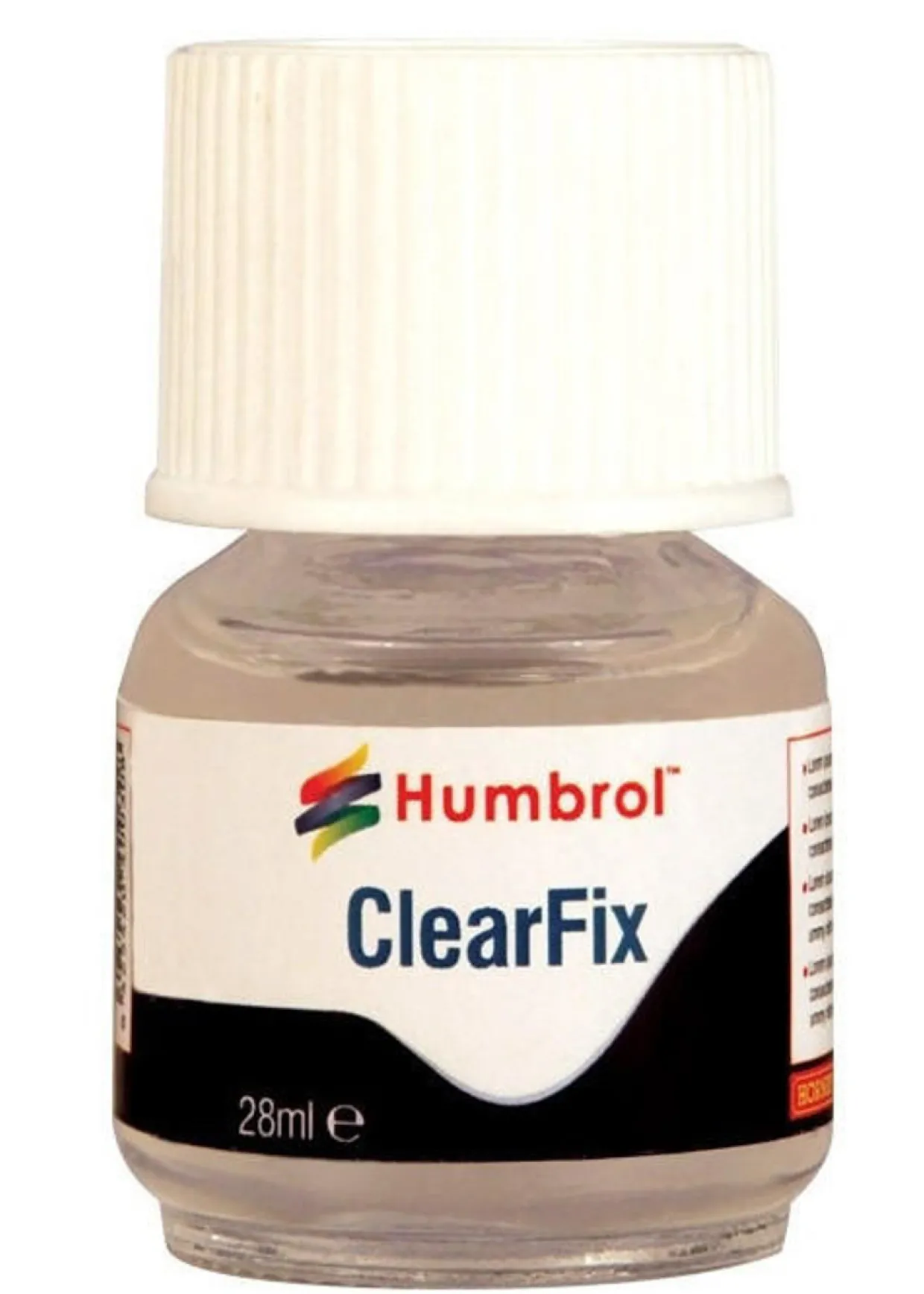 The Humbrol Clearfix 28ml for use as an adhesive on clear plastic parts and for making small windows on airliners.