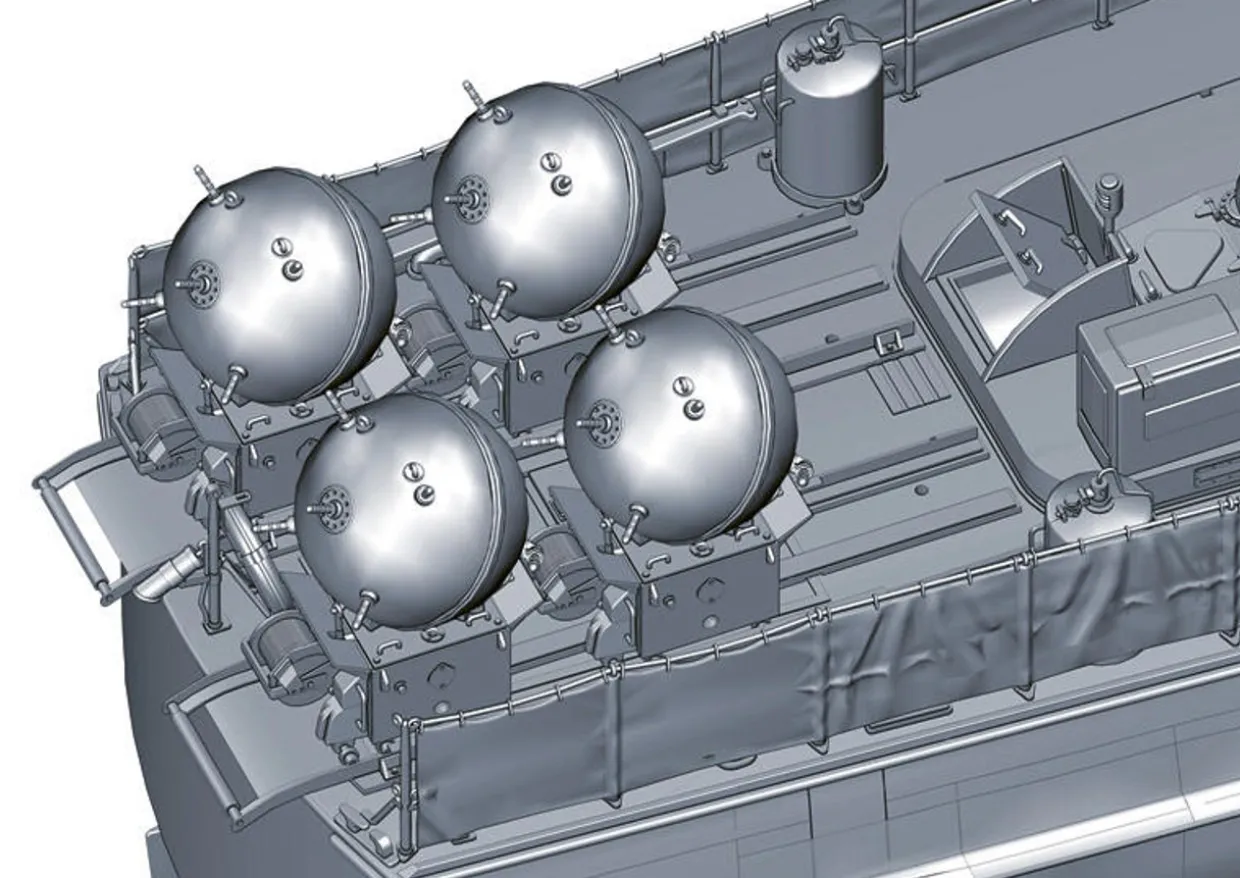 Between 1939 and 1940 the S-26 series was built and characterised by a forecastle integrated with two 533 mm torpedo tubes. The aesthetic features of the bow were maintained and further improved in subsequent versions. The S38 was one of the most celebrated Schnellboot versions, with almost 100 units produced. They were 35 meters long with a full load displacement of over 100 tons. With its Daimler Benz 12-cylinder engines it was able to reach a maximum speed of 39.5 knots.