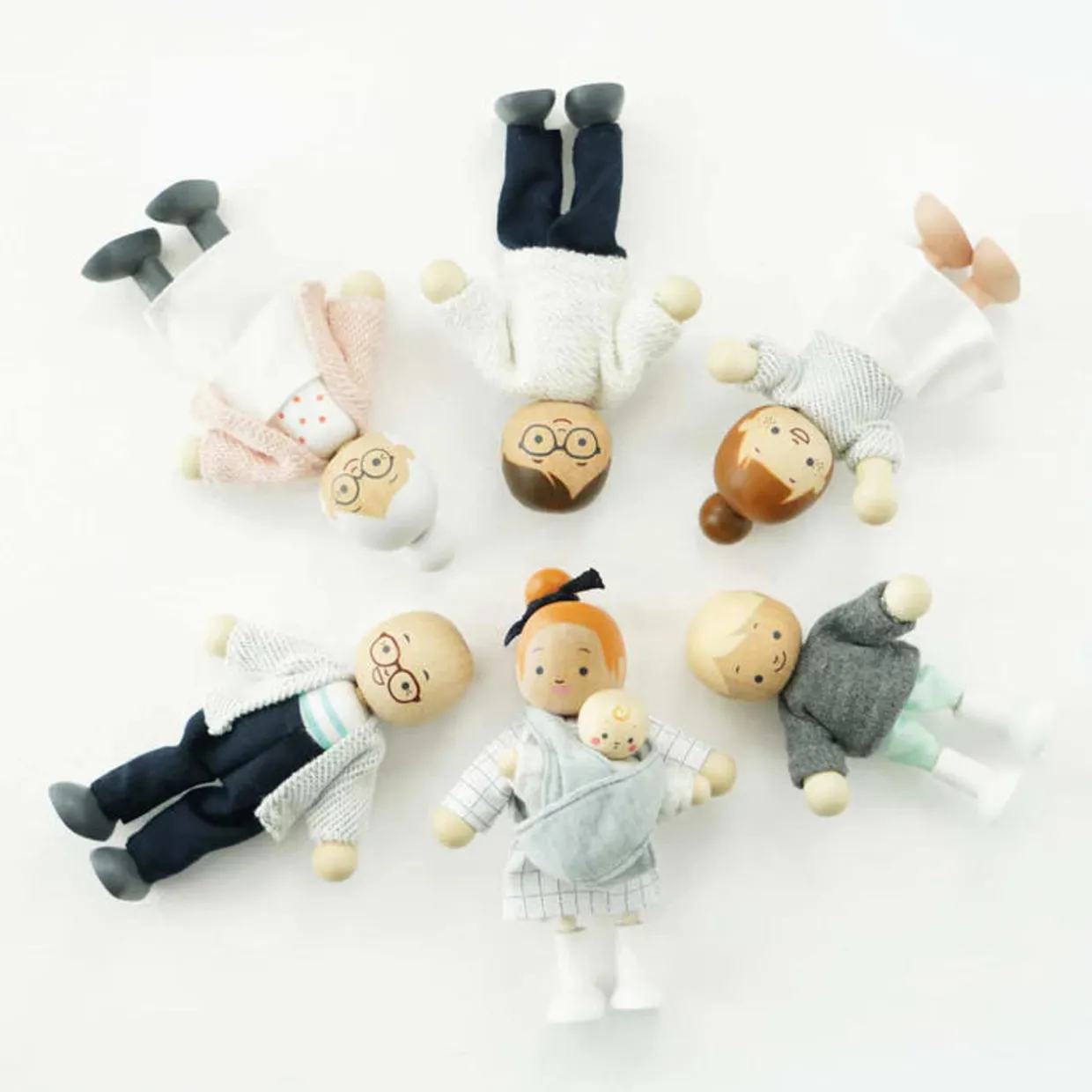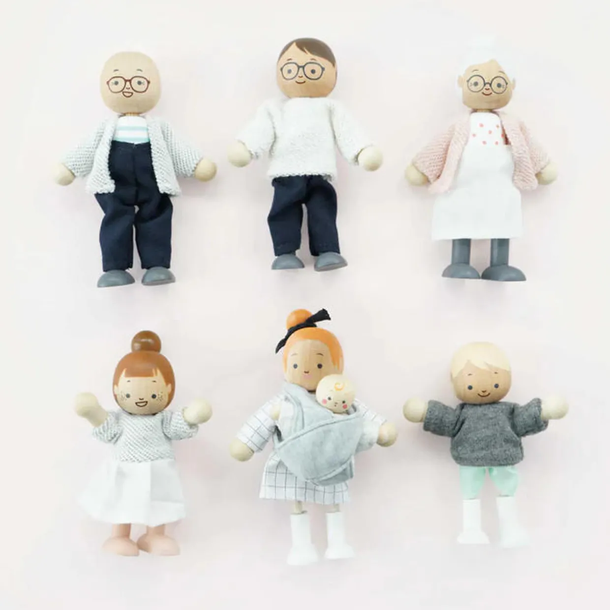 This lovely little doll family are ready to move into their brand new dream home. Comprising 7 highly detailed, poseable dolls, this set comprises parents, grandparents, children and baby complete with baby carrier. Crafted from sustainable FSC® – certified wood and dressed in beautiful hand finished outfits, they are ready to be welcomed to the neighbourhood. Compatible with our full range of beautiful wooden dolls houses and accessories.