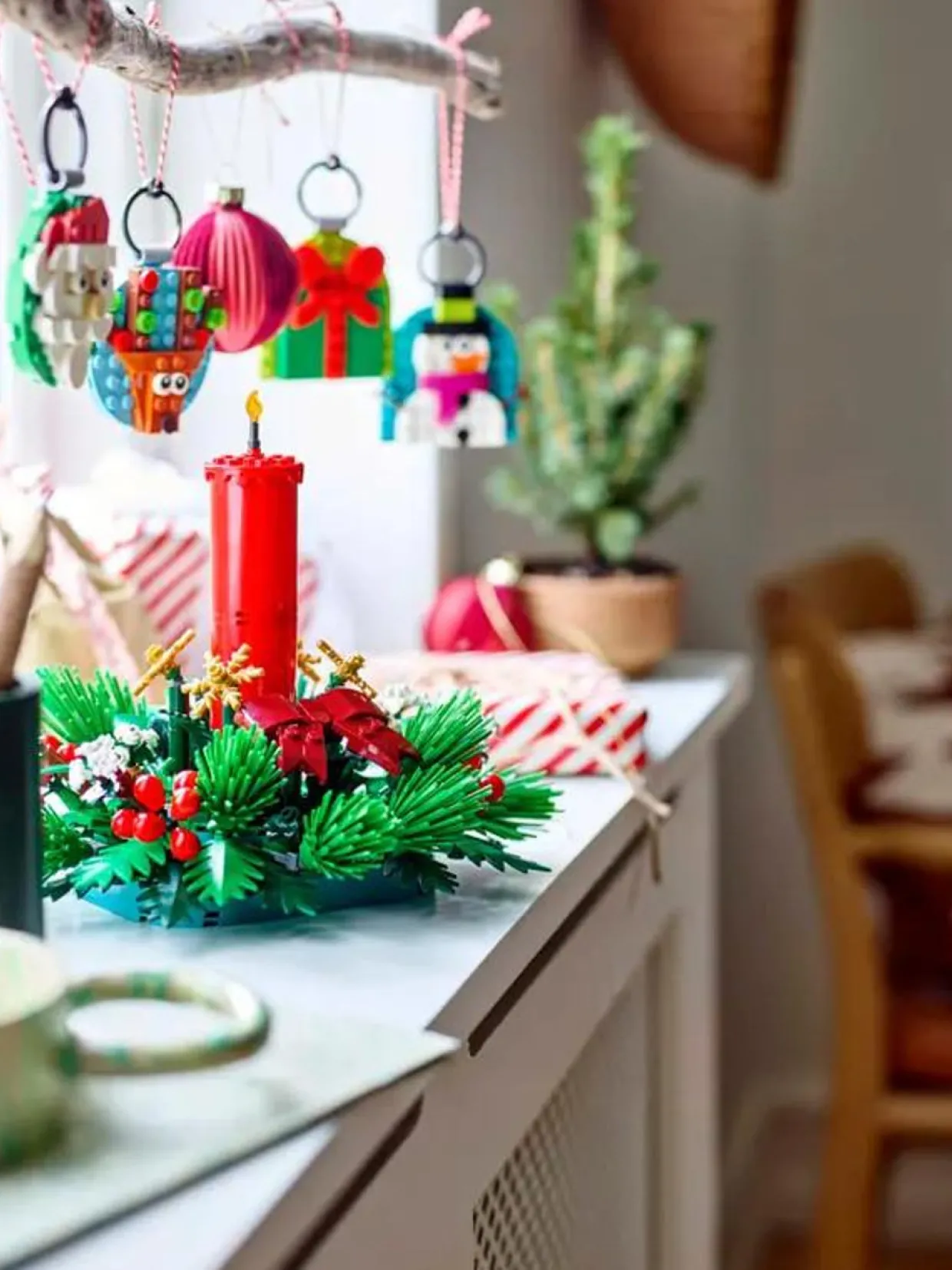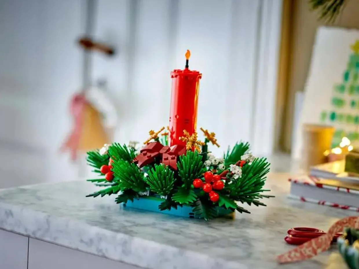 - Festive joy – The Christmas LEGO® set features a red candle at its center, surrounded by red berries, golden stars and green foliage