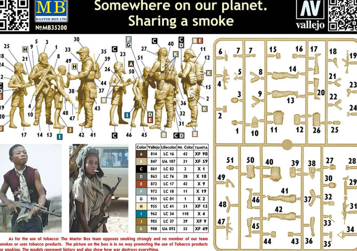 The Master Box 1/35 Somewhere On Our Planet Sharing a Smoke from our 1/35 scale figure model kits range accurately recreates the real-life fighters. This plastic model kit requires paint and glue to complete..