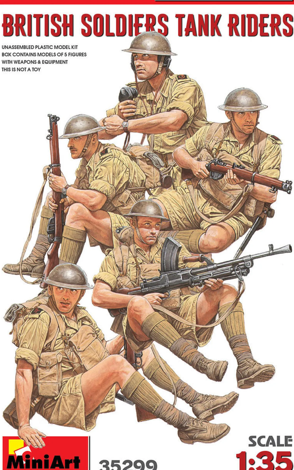 The MiniArt 1/35 British Tank Riders WWII from our 1/35 scale figure model kits range accurately recreates the real-life British soldiers from World War II. This plastic model kit requires paint and glue to complete..
