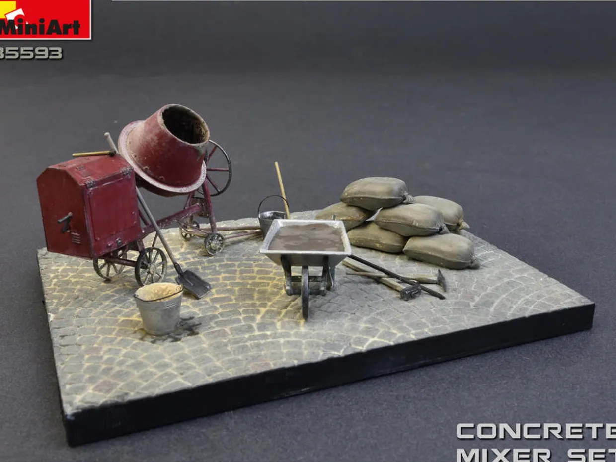 The MiniArt Concrete Mixer Set in 1/35 scale from the plastic model accessories range provides highly detailed diorama accessories perfect for use in 1/35 scale dioramas and wargames terrain. This plastic accessories kit requires paint and glue to complete.