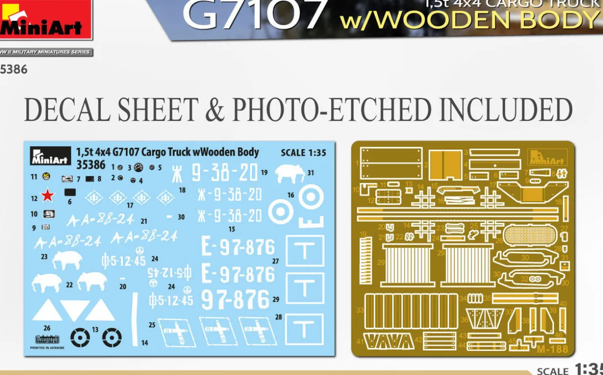 The Miniart 1/35 G7107 4×4 1.5t Cargo Truck Wooden Body from our 1/35 scale military vehicle model kits range range accurately recreates the real-life cargo truck used by the US Army during World War II. This plastic model kit requires paint and glue to complete.