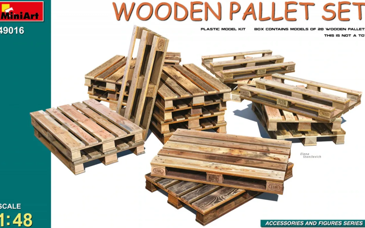 The MiniArt 1/48 Wooden Pallet Set from the plastic model accessories range provides highly detailed diorama accessories perfect for use in dioramas and wargames terrain. This plastic model kit requires paint and glue to complete.