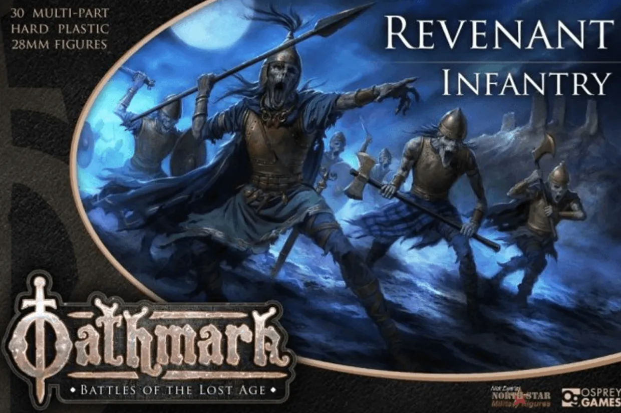 This boxed set offers enough parts to build 30 Revenant Infantry for your Oathmark armies. These ancient undead warriors can be armed with hand weapons and shields or two-handed weapons, and parts are also included to add banner bearers and officers to their ranks.