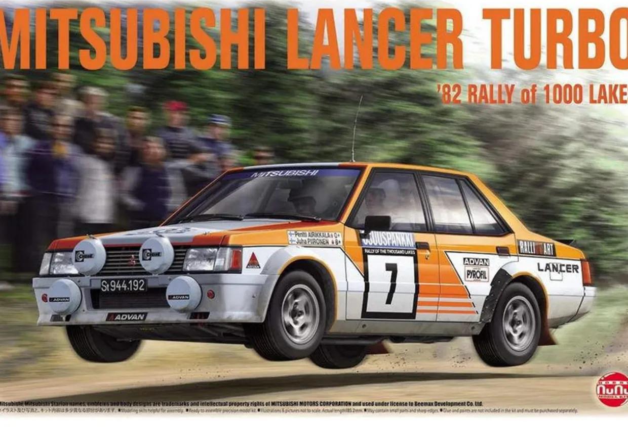 The NuNu 1/24 Mitsubishi Lancer Turbo 1982 Rally of 1000 Lakes kit from our 1/24 and 1/25 scale car model kits range accurately recreates the real-life rally car. This plastic model kit requires paint and glue to complete.