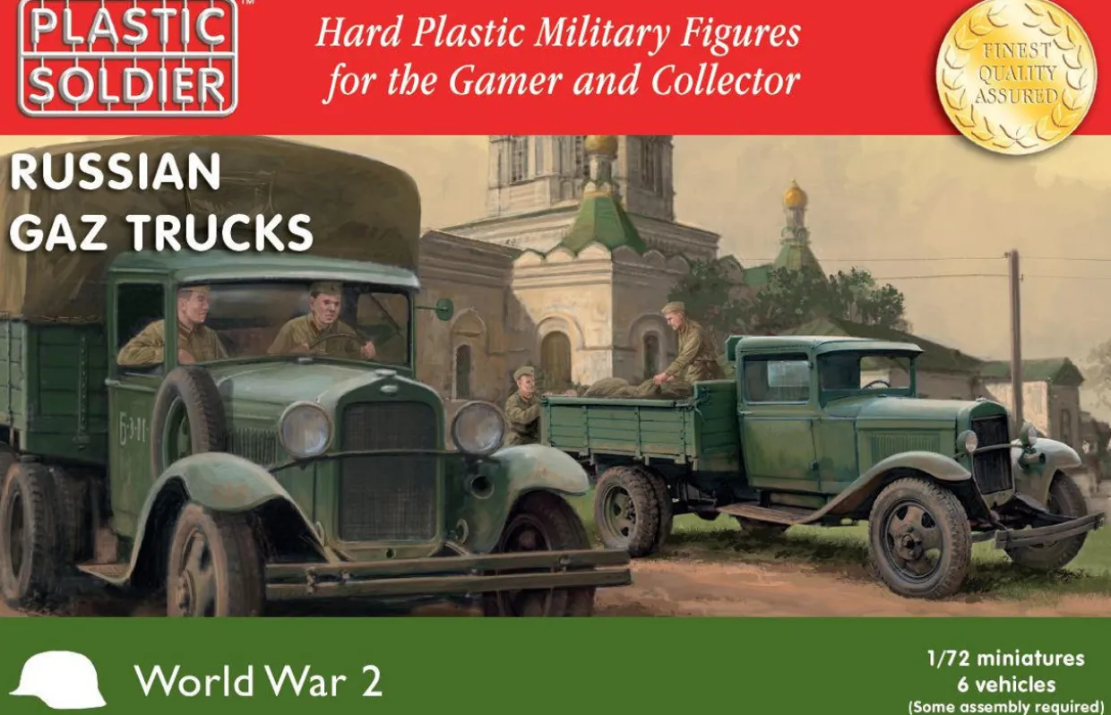 The Plastic Soldier Company 1/72 Russian GAZ Trucks from our 1/72 and 1/76 scale military vehicle model kits range range accurately recreates the real-life Soviet trucks from World War II. This plastic model kit requires paint and glue to complete. This box contains 6 models: 3 GAZ AA Trucks & 3 GAZ AAA Trucks.