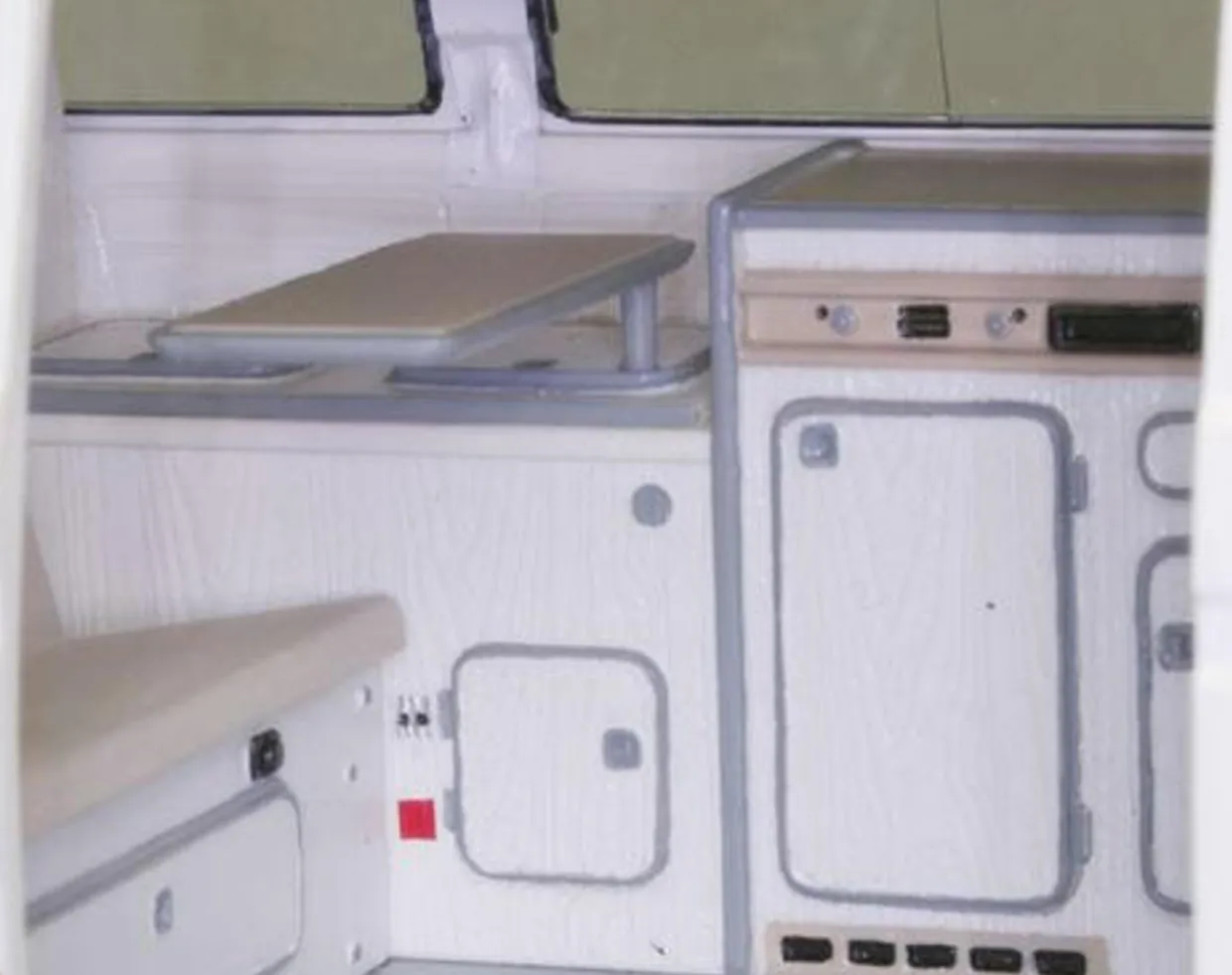 The deluxe version of the minibus, the special nine-seater model, is still known as the Samba Bus and, with its oval roof windows, very comfortable seats, a folding roof and very many chrome parts, has an unmistakable automobile charm. Thanks to its movable doors, the model enables one to look right into the roomy interior. As it was in great demand in the USA also, it is possible to build either the European or the American version.