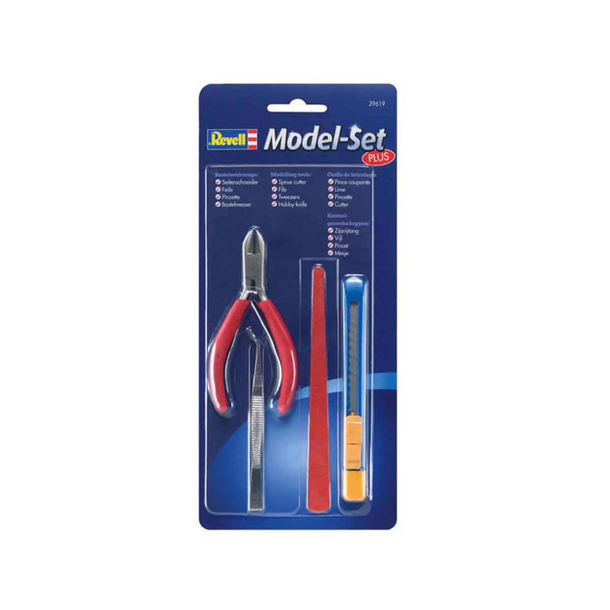 Revell Model-Set Plus & Modelling tools is a set of basic tools for successfully assembling a model. Contents: Sprue cutter, file, tweezers and hobby blade