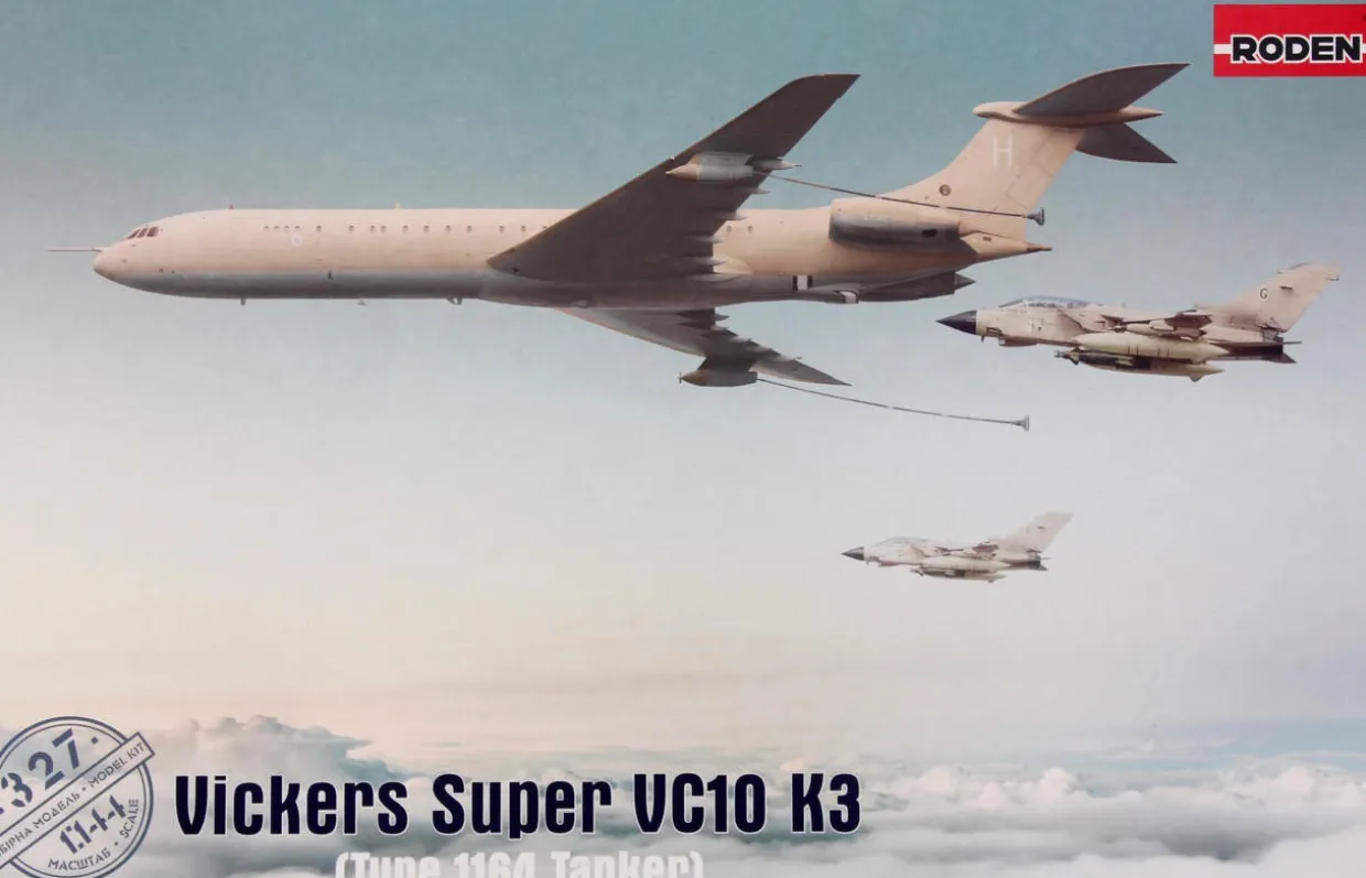 The Roden 1/144 Vickers Super VC10 K3 Type 1164 Tanker from our 1/144 and 1/288 scale aircraft model kits range accurately recreates the real-life British refuelling aircraft. This plastic model kit requires paint and glue to complete. Note that hoses are not included.