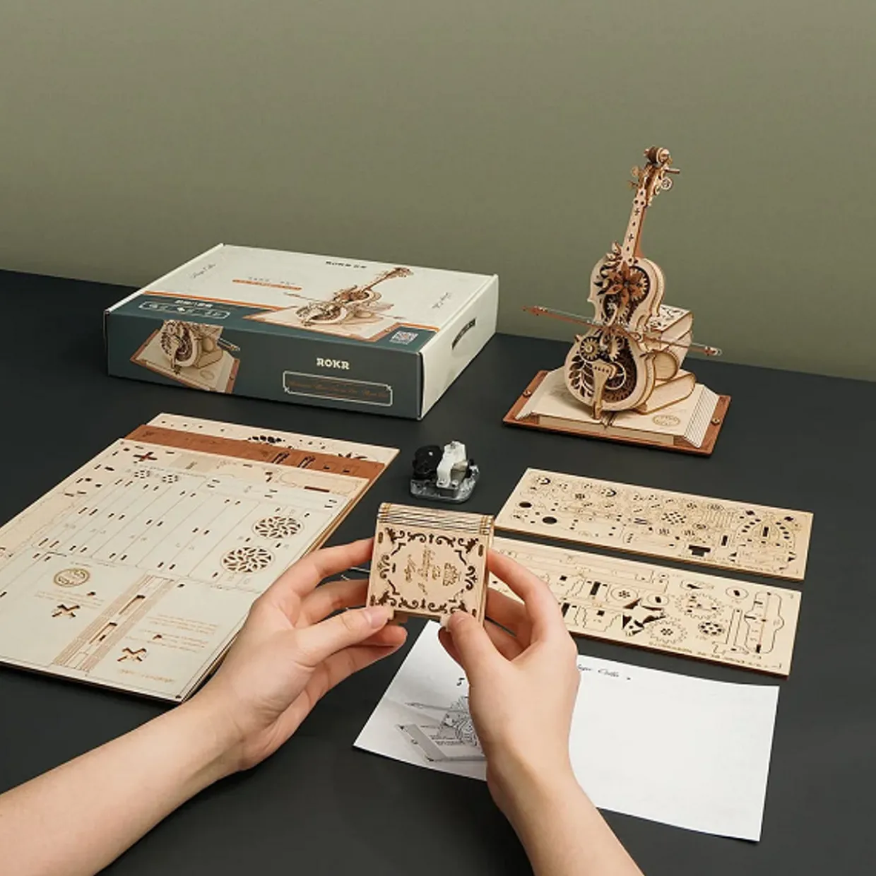 Born at the end of the 18th century, the music box solidified abstract music into a tangible artwork, witnessing the history of human civilization for more than 300 years. ROKR thus designed the Mechanical Music Box Series, which puts the ‘time’ in small ‘spaces’. The elegant and beautiful cello, with its traditional classical high class feel, has always been loved by people, so ROKR has incorporated the cello into the “mechanical music box”, and designed this Magic Cello music box 3D wooden puzzle.