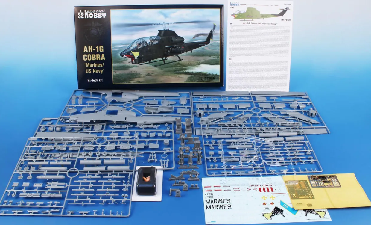 The Special Hobby 1/32 Bell AH-1G Cobra Marines/US Navy Hi-Tech from our helicopter model kits range accurately recreates the real-life American built attack helicopter. This plastic model kit requires paint and glue to complete.