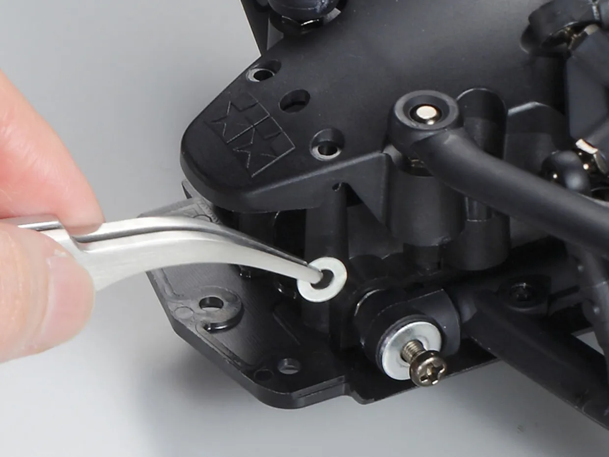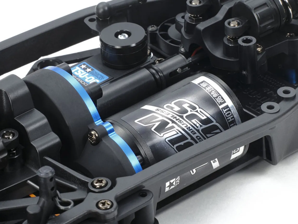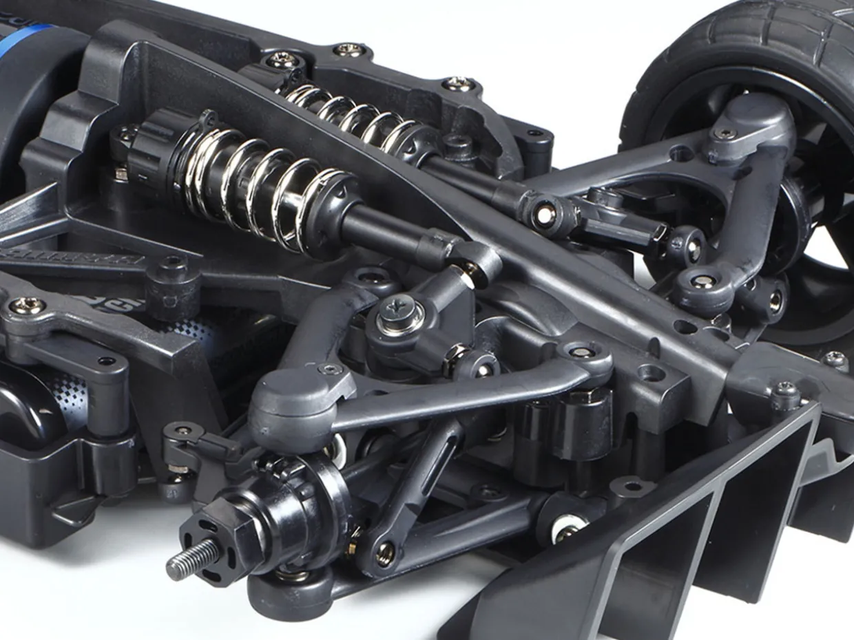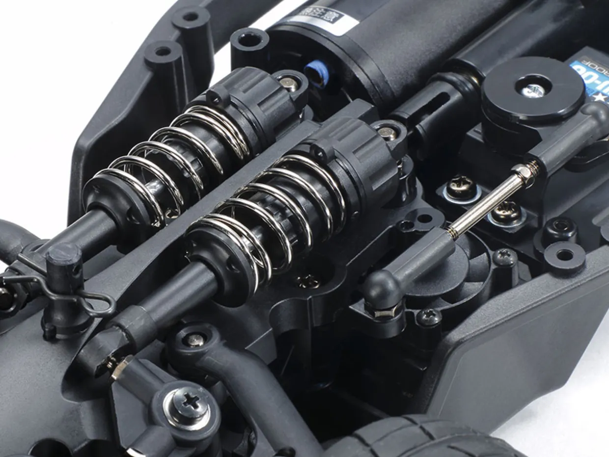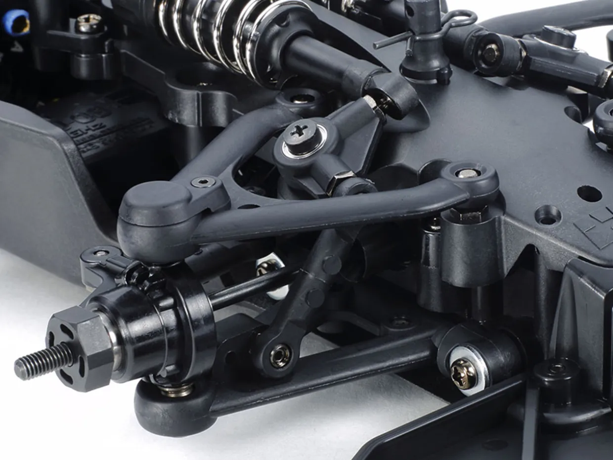 This durable composite monocoque-frame chassis provides shaft driven 4WD from a central motor via front and rear propeller shafts, with oil filled gear differentials. 4-wheel independent double wishbone suspension employs long arms, plus inboard setups front and rear with oil shock-dampers actuated by push rods and rocker arms to allow the use of low-profile bodies. Adjust spacer width to easily alter camber, skid, and toe angle settings. Both suspension arms and uprights are identical left, right, front and rear, for more efficient maintenance and pit work.