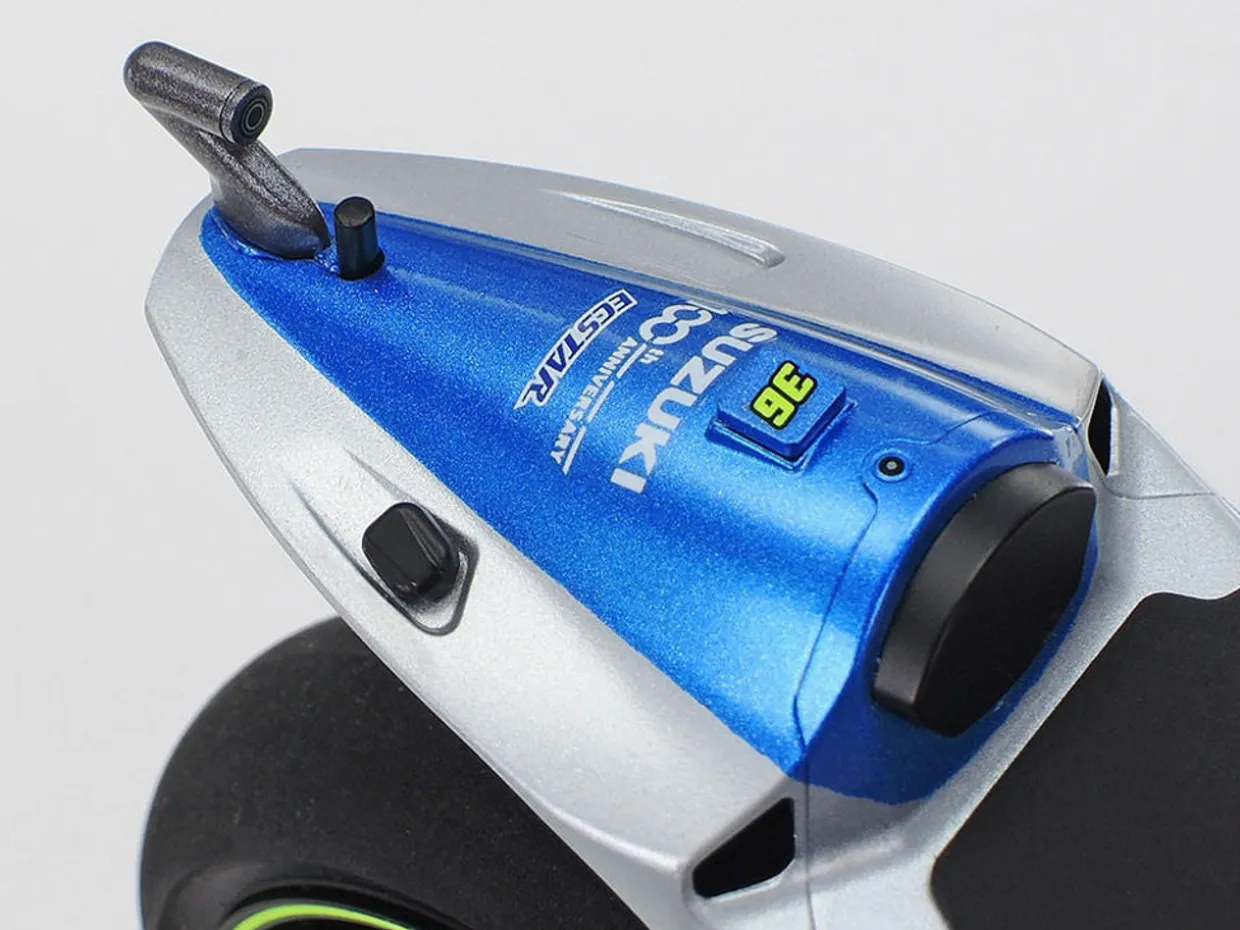 This model assembly kit recreates the Team Suzuki ECSTAR GSX-RR as it competed and won the 2020 MotoGP championship. With the name of Suzuki’s hi-spec engine oil brand, ECSTAR, this bike featured a blue and silver scheme inspired by 1960s GP models, and was ridden by Joan Mir and alex Rins. Mir stood on the podium seven times including a victory in the 13th European GP, and Rins secured third in the season with a win in the 11th Aragon GP. Suzuki celebrated 2020 as the centenary of its establishment, and 60 years since its first foray into motorcycle road racing with their first MotoGP championship. Constantly developed from its debut in 2015, the Suzuki ECSTAR GSX-RR ’20 employed a 1,000cc, water-cooled 4-stroke inline-4 engine capable of 340km/h maximum speed, and aerodynamic form.