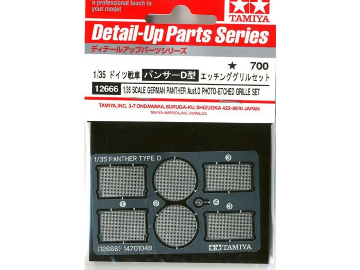 The Tamiya 1/35 German Pz. Kpfw. V Panther Ausf. D – Photo Etched Grille Set from the model accessories range provides accurately reproduced photo-etched grille detail parts for use with the Tamiya 1/35 German Pz. Kpfw. V Panther Ausf. D model kit.