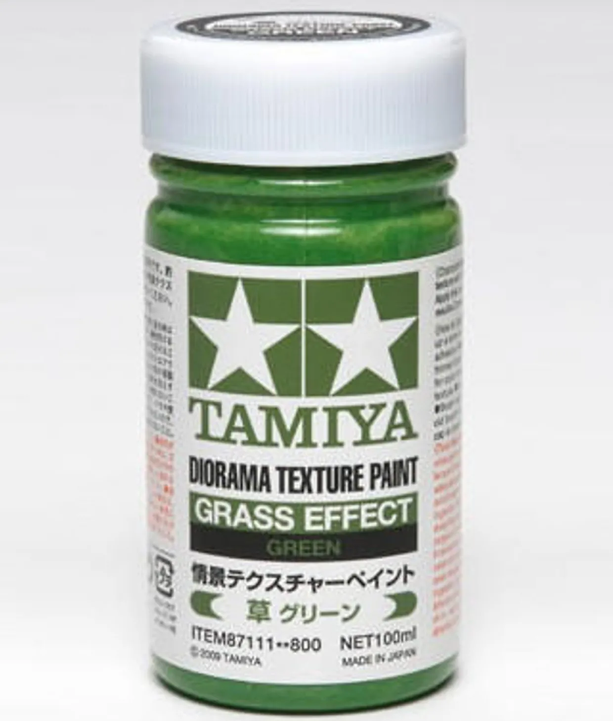 The Tamiya Diorama Texture Paint Grass Green 100ml is a water-based paint featuring a paste-like texture with special resin particles for recreating dirt surfaces.