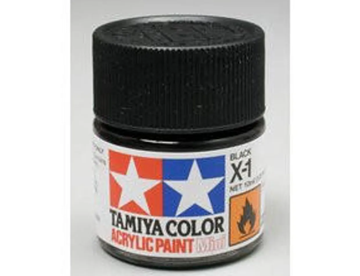 The Tamiya Mini X-01 Black Acrylic Paints come in 10ml bottles and are water-soluble and non-toxic. They are suitable to paint plastic model kits and come in three finishes, gloss, flat and translucent. The Tamiya Acrylic Paint range can be brushed straight from the tub, or thinned to be used in an airbrush.