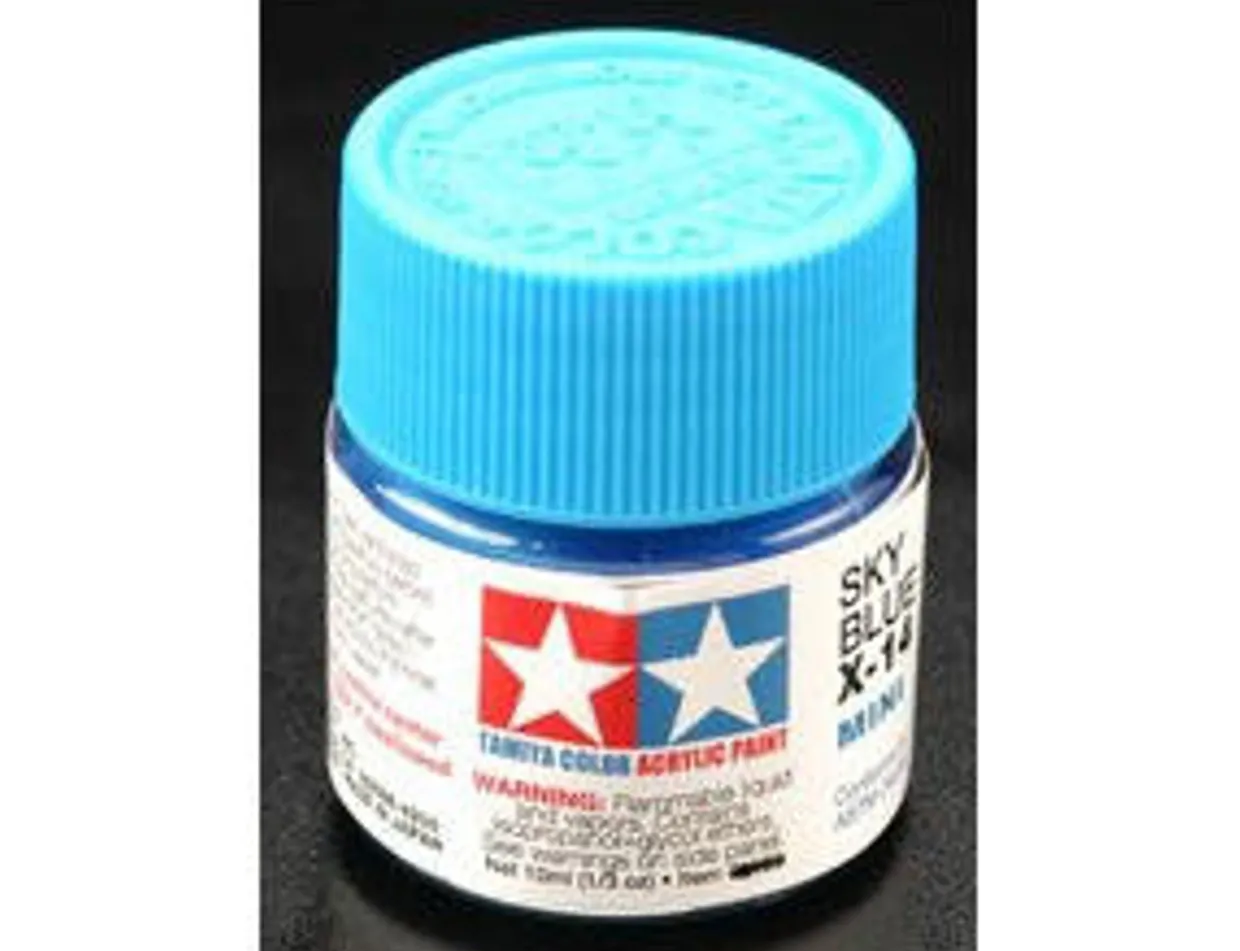The Tamiya Mini X-14 Sky Blue Acrylic Paints come in 10ml bottles and are water-soluble and non-toxic. They are suitable to paint plastic model kits and come in three finishes, gloss, flat and translucent. The Tamiya Acrylic Paint range can be brushed straight from the tub, or thinned to be used in an airbrush.