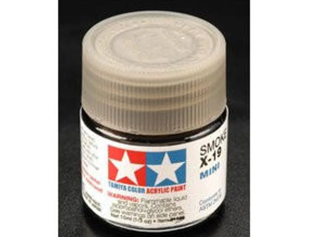 The Tamiya Mini X-19 Smoke Acrylic Paints come in 10ml bottles and are water-soluble and non-toxic. They are suitable to paint plastic model kits and come in three finishes, gloss, flat and translucent. The Tamiya Acrylic Paint range can be brushed straight from the tub, or thinned to be used in an airbrush.