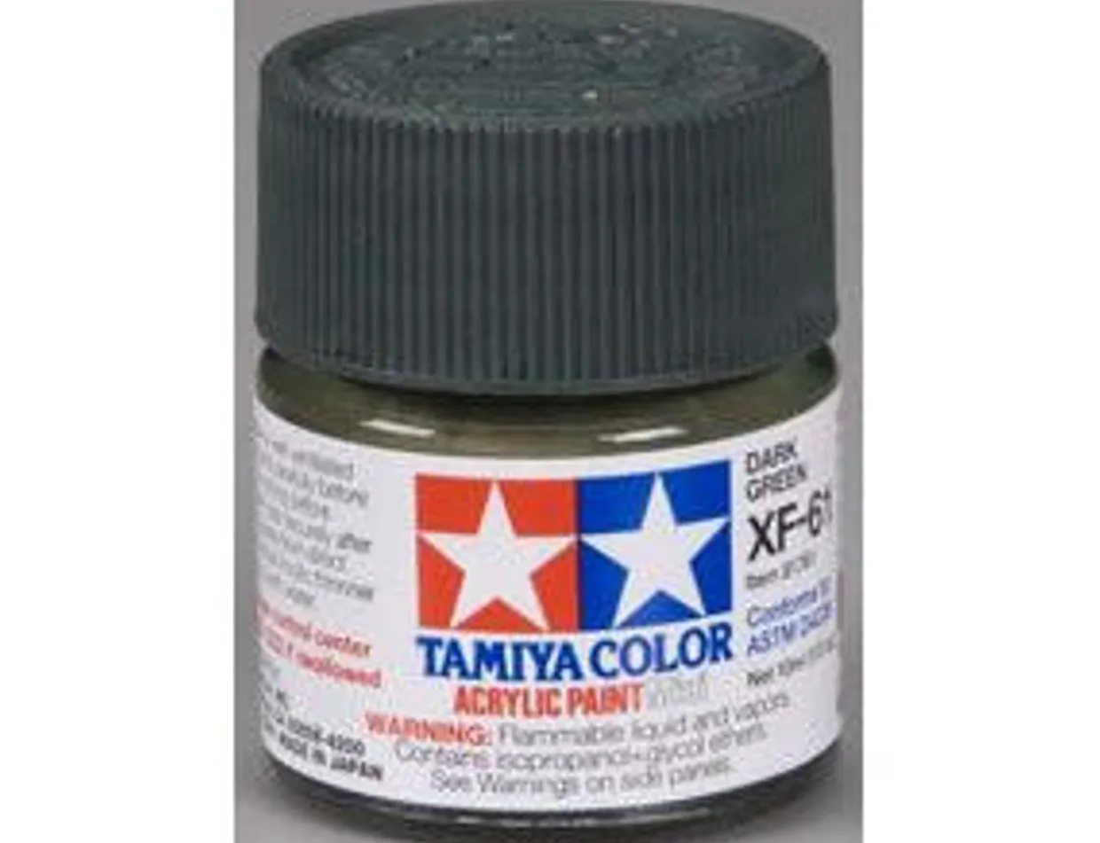 The Tamiya Mini XF-61 Dark Green Acrylic Paints come in 10ml bottles and are water-soluble and non-toxic. They are suitable to paint plastic model kits and come in three finishes, gloss, flat and translucent. The Tamiya Acrylic Paint range can be brushed straight from the tub, or thinned to be used in an airbrush.