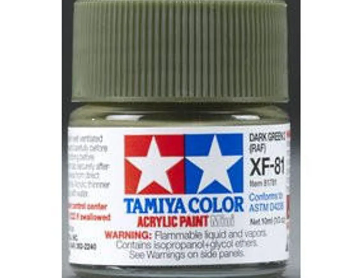 The Tamiya Mini XF-81 RAF Dark Green 2 Acrylic Paints come in 10ml bottles and are water-soluble and non-toxic. They are suitable to paint plastic model kits and come in three finishes, gloss, flat and translucent. The Tamiya Acrylic Paint range can be brushed straight from the tub, or thinned to be used in an airbrush