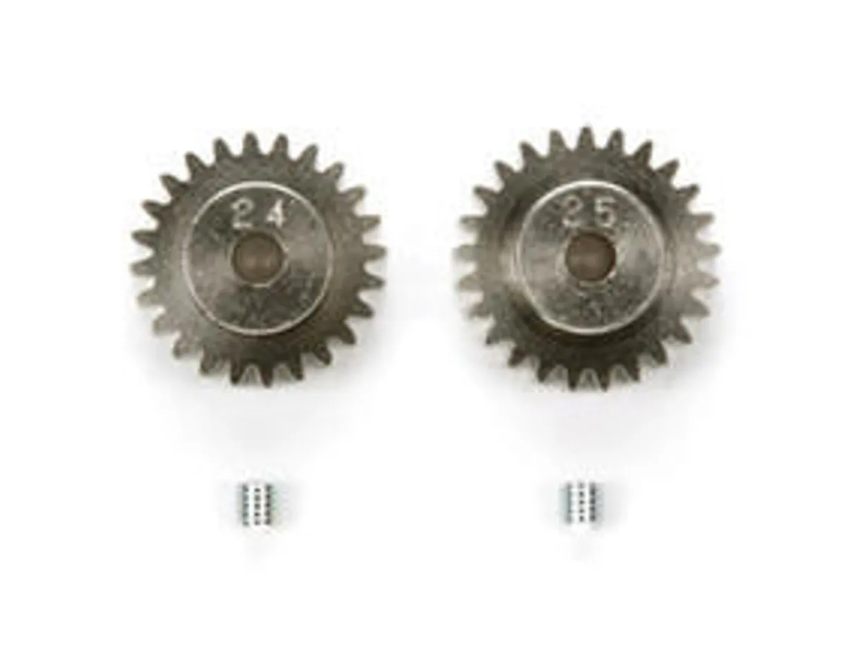 The Tamiya Pinion Gear Set 24T/25T is a set of RC Parts. They are 48 pitch metric 24 tooth and 25 tooth gears. The number of teeth is stamped on the pinion so they cannot be confused which is which. They are made of aluminum.