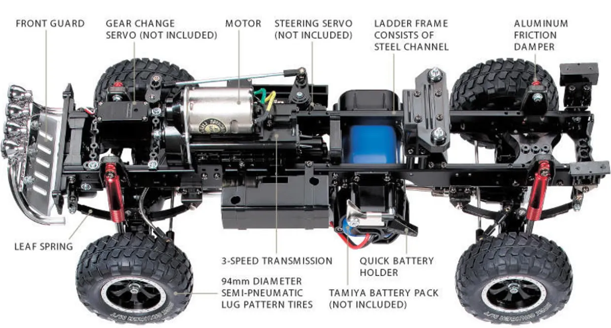 - Battery: 6-cell flat with standard Tamiya connector