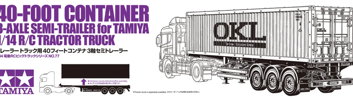 We are delighted to announce the release of the 40-Foot Container 3-Axle Semi-Trailer for Tamiya 1/14 R/C Tractor Truck which features Tamiya original design. Cargo containers designed under ISO specifications are most common for international logistics, and include a 40ft type. This 3-axle semi-trailer with a 40ft. regular height container can be connected to any Tamiya’s 1/14 scale Tractor Trucks.