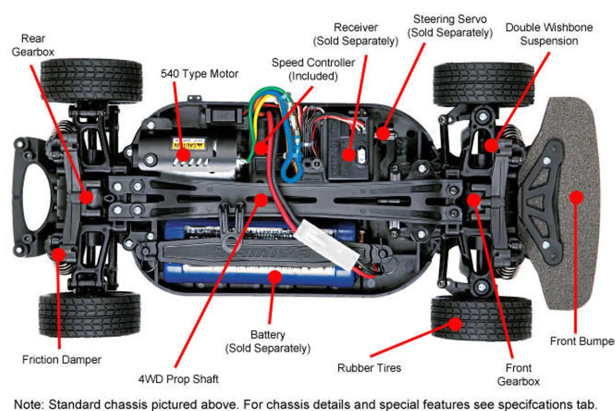 - Battery: 6-cell flat with standard Tamiya connector