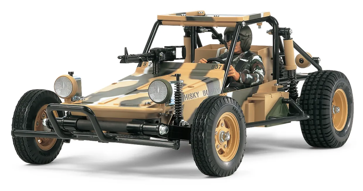This re-released version features improvements to meet the modern R/C standard while maintains the same basic chassis design as the original 1984 model. It also features a realistic body, roll cage, and a driver figure as well as equipment such as a machine gun, which can all be finished with plastic model paints. In addition, the black/white/olive drab camouflage pattern can be easily depicted with kit-included stickers. Semi-pneumatic grooved front and rear tires with block-pattern tread offer superb traction on off-road surfaces.